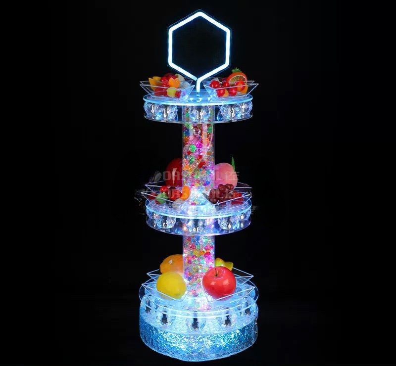 An elegant vertical LED fruit serving base with vibrant color-changing illumination that adds a luxurious touch to any display table or buffet.