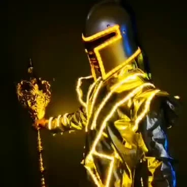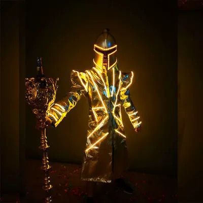 A luxury gold LED illuminated suit inspired by futuristic performances, delivering a powerful presence and stunning visual impact at any event.