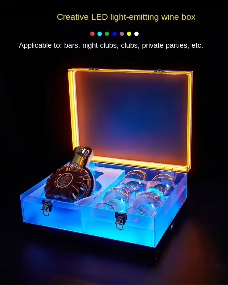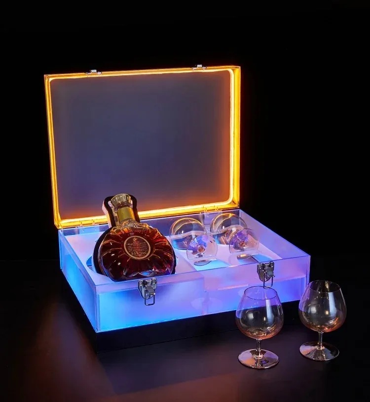 A premium LED drink serving box featuring vibrant color-changing lighting that adds a stunning VIP touch to the presentation of bottles and glasses.